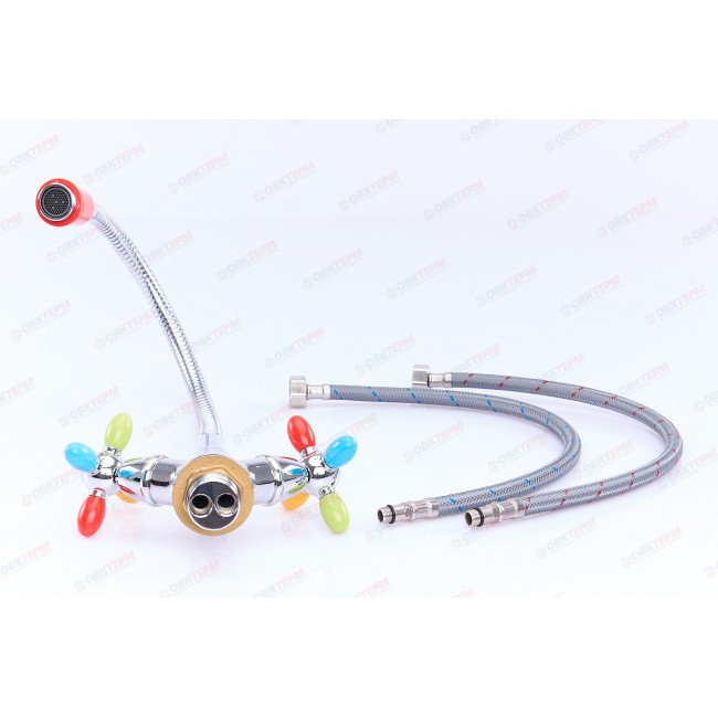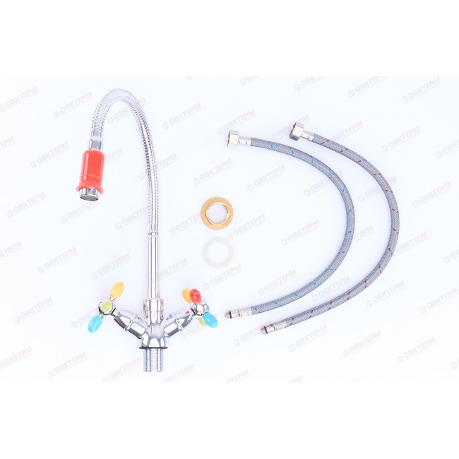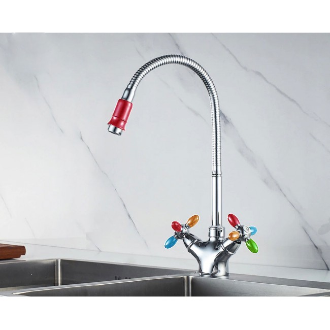 Количество в коробке: 10шт. Смеситель для кухни Zerix отличается максимально удобным функционалом. Он оборудован гибким вращающимся изливом и двухвентильным управлением - керамическими кранами-буксами. Излив и вентили украшены цветными силиконовыми вставками. Корпус изделия имеет хромированное покрытие, которое обеспечивает защиту от царапин и коррозии.