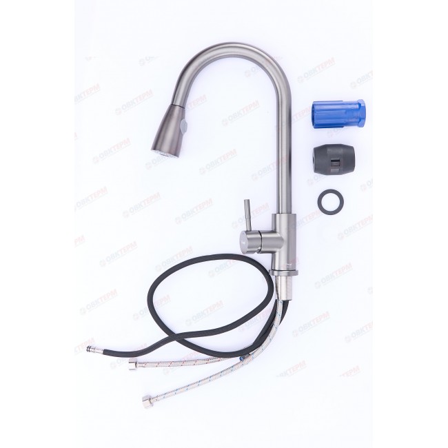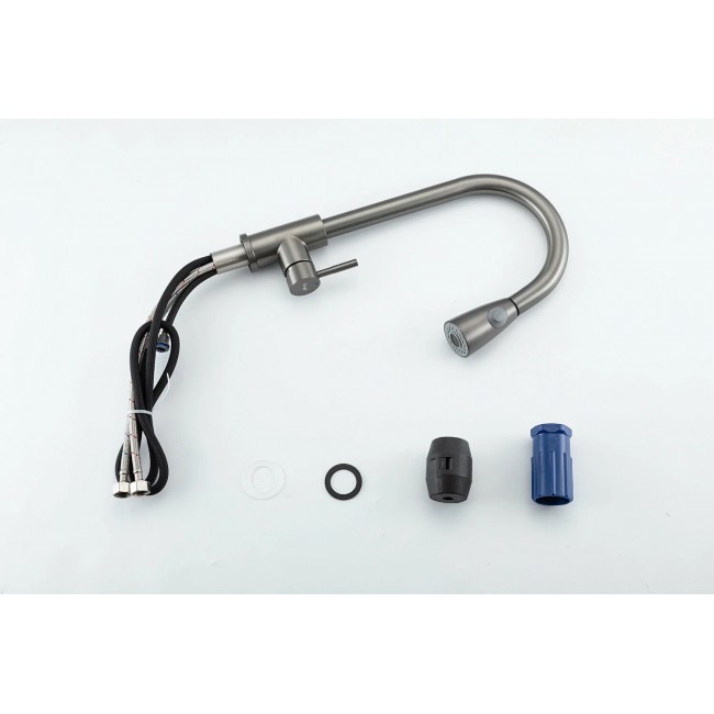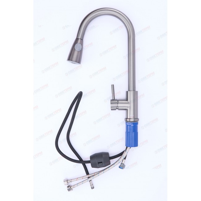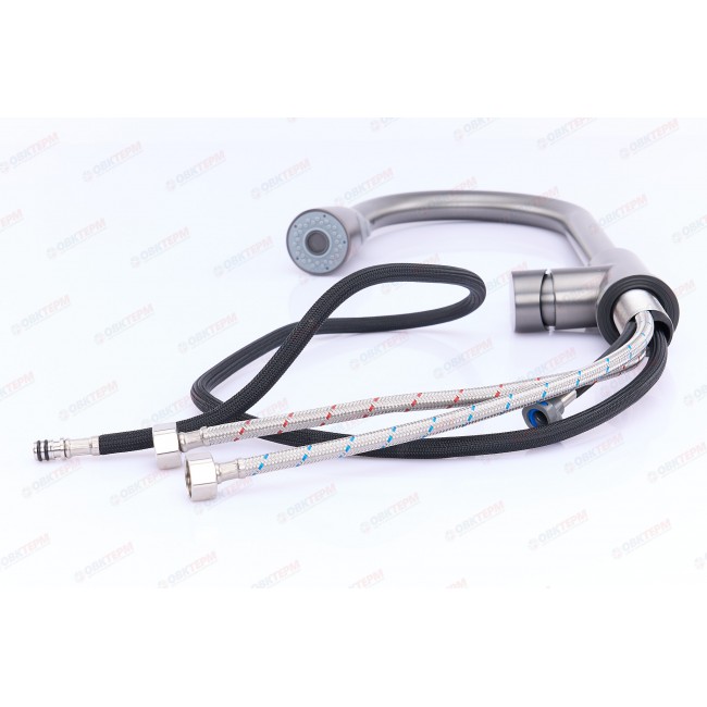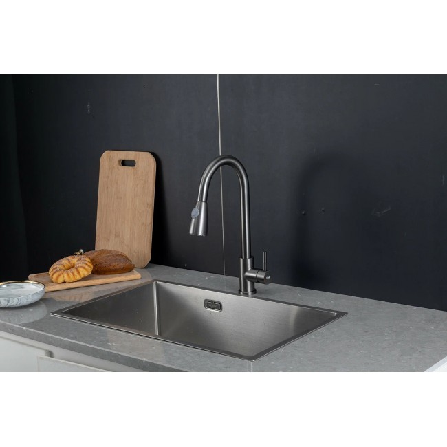 Смеситель для кухни Frap F60991-9 выполнен в оружейной стали, что придает ему стильный и современный вид. Темно-серый цвет корпуса и покрытие PVD делают его не только привлекательным, но и устойчивым к царапинам и пятнам.