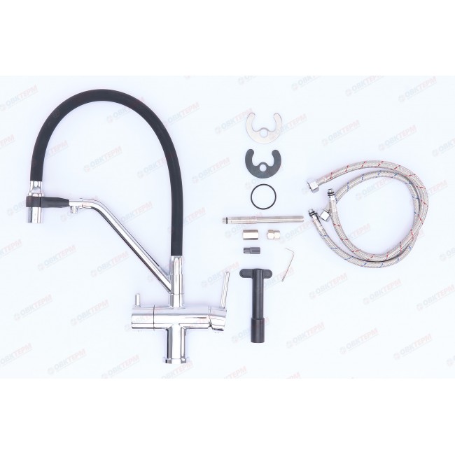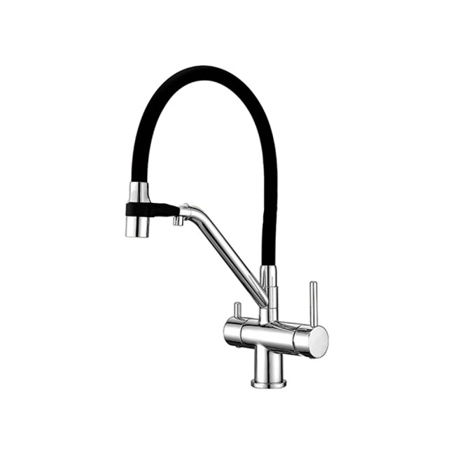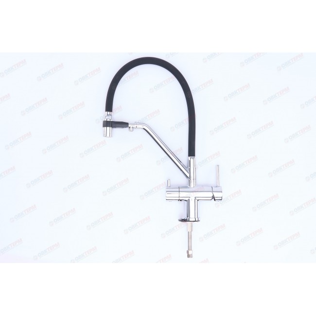 Комбинированные смесители – более современное и универсальное решение. Так называемый смеситель «2 в 1» рассчитан на подачу и водопроводной, и питьевой воды. Фактически подача происходит из одного излива, но из разных трубок. Для включения подачи очищенной воды на смесителе предусмотрен отдельный вентиль или рычаг.