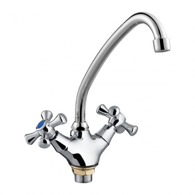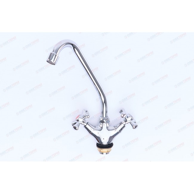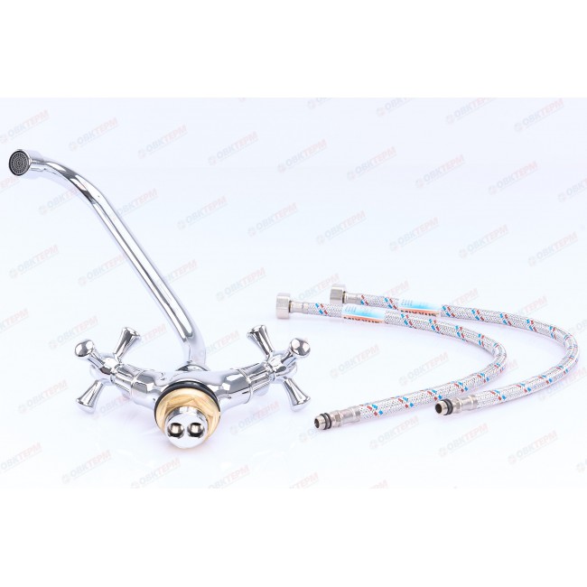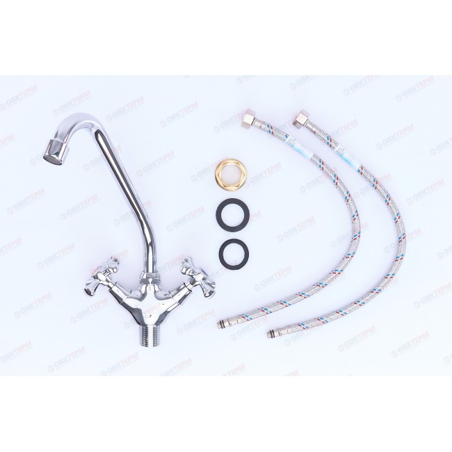 Количество в коробке: 10шт. Силуминовый вентильный (кран-буксовый) смеситель для кухни с поворотным высоким носом, комплектуется гибкой подводкой 45 см. Смеситель предназначен для встроенного монтажа на одно отверстие, крепление «гайка». Принцип смешивания воды — двухручковый.
