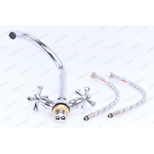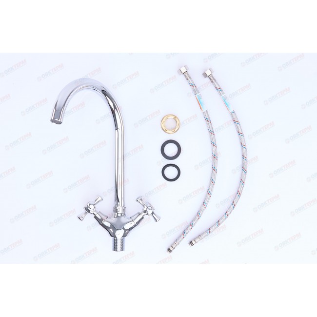 Количество в коробке: 10шт. Силуминовый вентильный (кран-буксовый) смеситель для умывальника с поворотным высоким носом, комплектуется гибкой подводкой 45 см. Смеситель предназначен для встроенного монтажа на одно отверстие, крепление «гайка». Принцип смешивания воды — двухручковый.