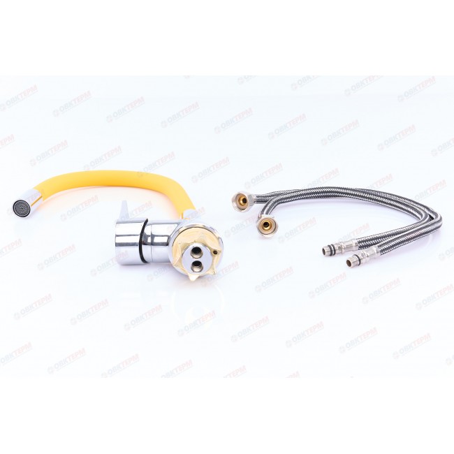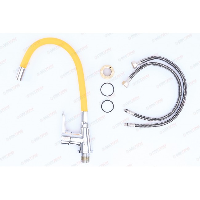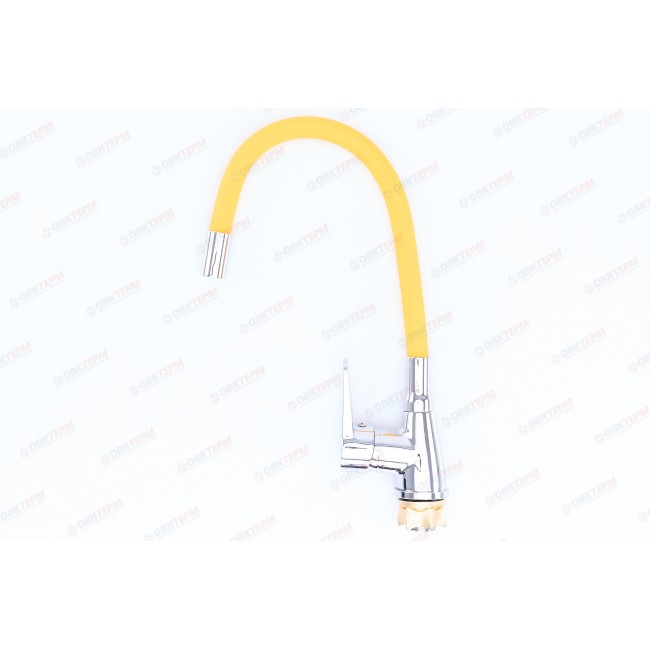 Количество в коробке: 10шт. Одноручковый смеситель для кухни ZERIX SOP7 045 с желтым гибким изливом монтируется под одно отверстие (мойка, столешница, подоконник) на гайку. Материал корпуса - стойкий к коррозии силумин (сплав алюминия с кремнием). Покрытие корпуса - зеркальный хром. Особенность смесителя - желтый гибкий силиконовый излив. Запорный элемент - керамический картридж 40 мм. Подключается к трубопроводу двумя гибкими подводками, которые идут в комплекте вместе с крепежным элементом, аэратором и резиновыми прокладками.