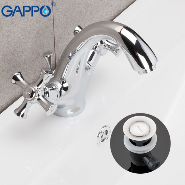 Смеситель для раковины Gappo G1042, оснащён двумя рычагами для того, чтобы контролировать напор воды. Аэратор в приборе позволит обеспечить равномерный поток воды , а также ее смягчение. Сетка внутри устройства отфильтровывает примеси. Монтируется на шпильке. На нижнюю часть прибора устанавливается резинка, чтобы смеситель не царапал и не елозил по столешнице, далее вкручиваются шпильки. Получившуюся конструкцию устанавливаем в отверстие, внизу насаживаем на крепление и затягиваем гайка