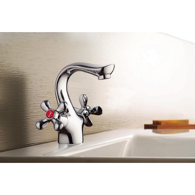 Количество в коробке: 10шт. Смеситель для умывальника двухвентильный - сантехнический прибор, предназначенный для регулирования и смешивания горячей и холодной воды, что позволяет получить единый поток с максимально комфортной температурой. Данный смеситель предназначен для умывальника и представляет собой корпус с изливом, имеющий управляющий элемент в виде рычага, позволяющего "запоминать" температуру воды, использовавшуюся перед этим.
