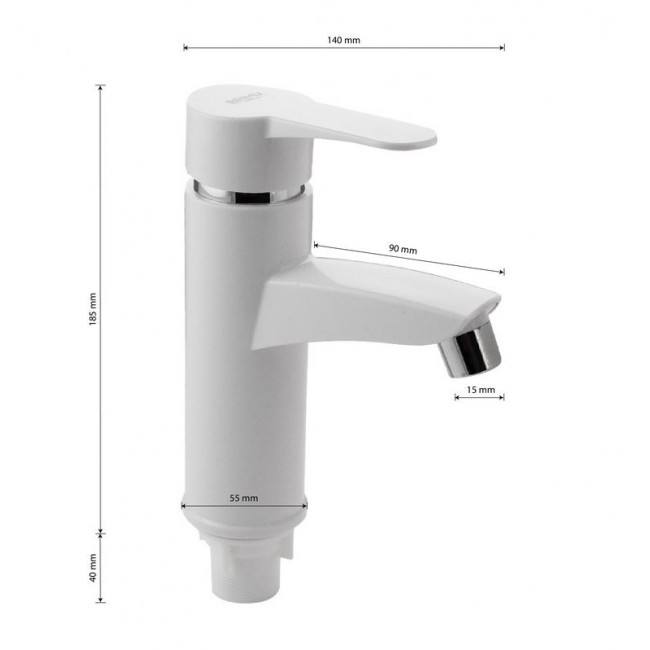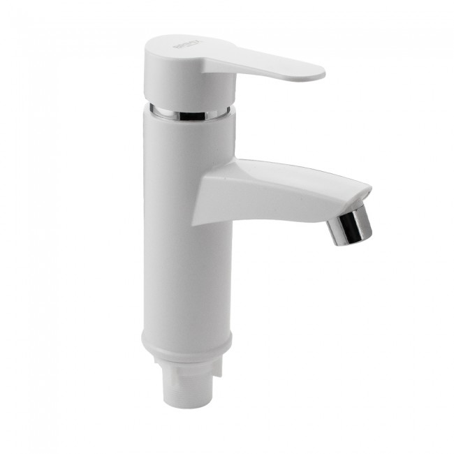 Смеситель для раковины, из высокопрочного пластика АБС - БЕЛЫЙ с коротким изливом, литой корпус, литая ручка, шаровый, Крепление резьба- гайка, картридж d=40 мм. хромированный аэратор для экономии воды.Габаритные размеры: высота 160 мм, длина 145 мм, длина излива 105 мм, диаметр посадочного седла 50 мм, длина резьбы 50 мм, длина подводки 400 мм