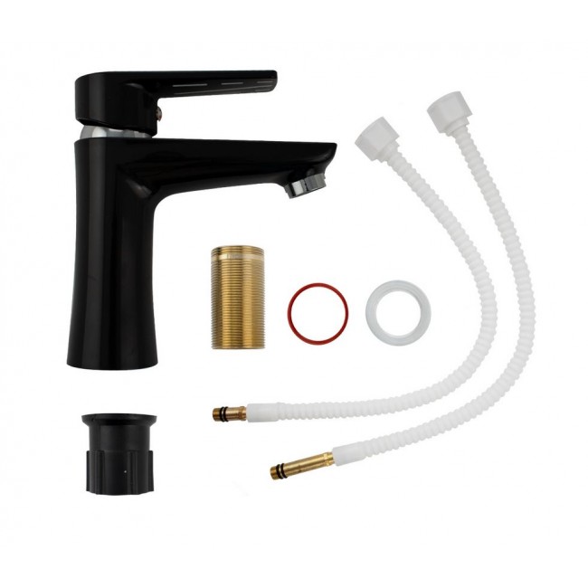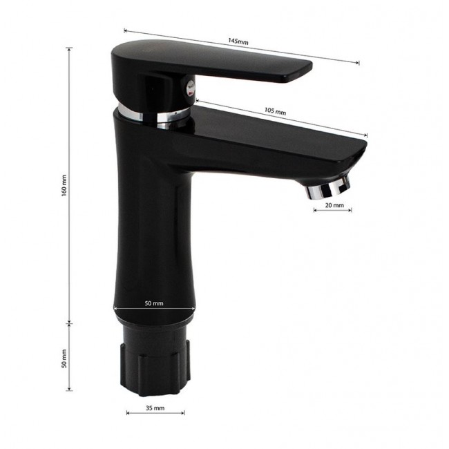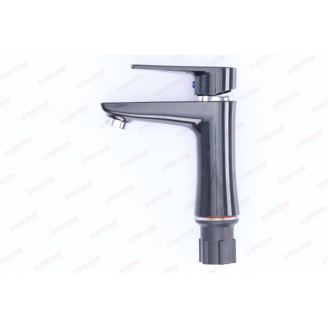 Смеситель для раковины, из высокопрочного пластика АБС - черный с коротким изливом, литой корпус, литая ручка, шаровый, Крепление резьба- гайка, картридж d=40 мм. хромированный аэратор для экономии воды.Габаритные размеры: высота 160 мм, длина 145 мм, длина излива 105 мм, диаметр посадочного седла 50 мм, длина резьбы 50 мм, длина подводки 400 мм