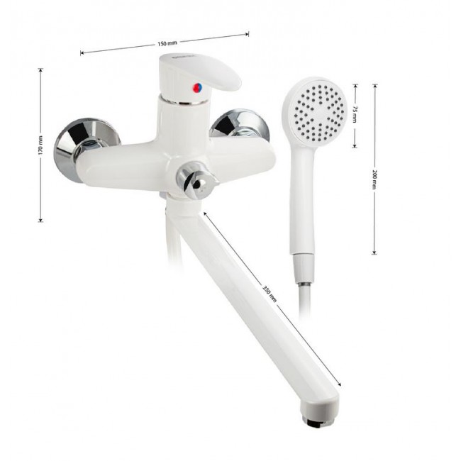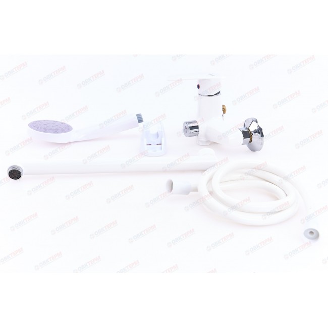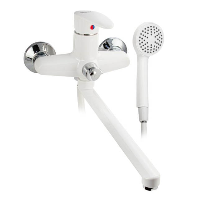 Смеситель из высокопрочного пластика АБС - БЕЛЫЙ в ванную/душевую комнату с длинным, плоским изливом, литой корпус, шаровый с дивертором м/к на корпусе. Картридж d= 40мм, литая ручка,хромированный аэратор для экономии воды, хромированные чашки и эксцентрики. Габаритные размеры: ширина 150 мм, высота корпуса 170 мм, длина излива 300 мм, душевая лейка d=80 мм, шланг 150 см.
