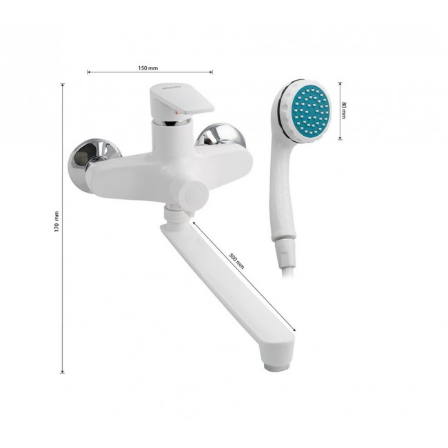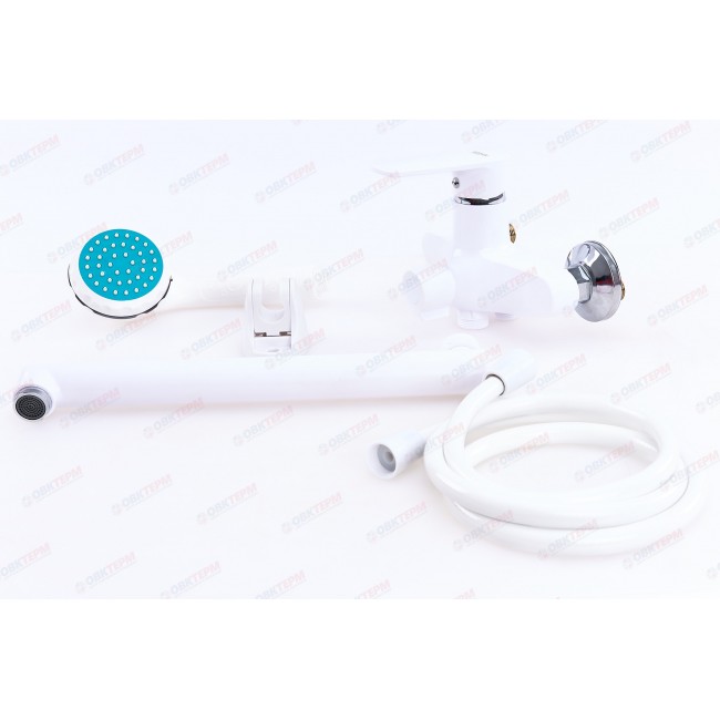 Смеситель из высокопрочного пластика АБС - БЕЛЫЙ в ванную/душевую комнату с длинным, плоским изливом, литой корпус, шаровый с дивертором м/к на корпусе. Картридж d= 40мм, литая ручка,хромированный аэратор для экономии воды, хромированные чашки и эксцентрики. Габаритные размеры: ширина 150 мм, высота корпуса 170 мм, длина излива 300 мм, душевая лейка d=80 мм, шланг 150 см.