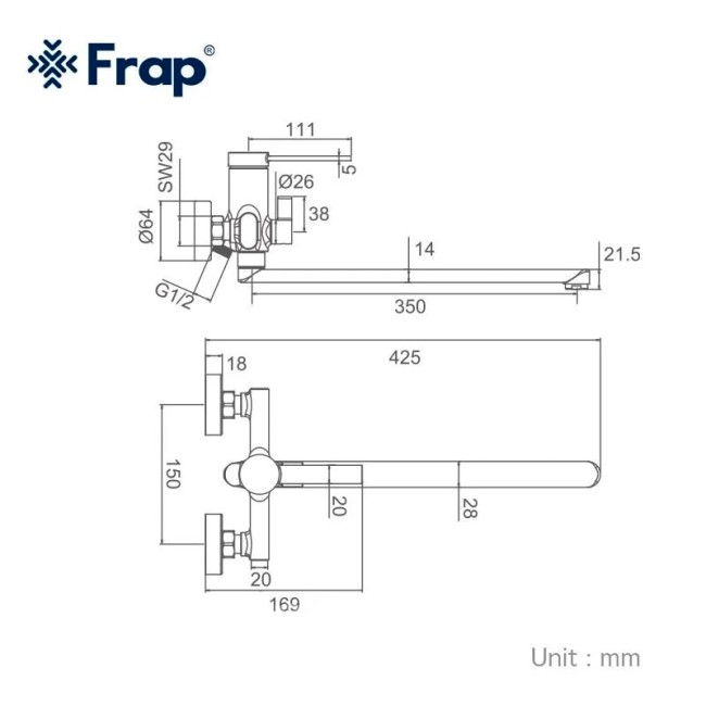 Смеситель для ванны Frap F2267 с длинным изливом. В комплекте все необходимое, включая душевую лейку и душевой шланг. Смеситель для ванны Frap F2267 изготовлен из 100% латуни с использованием керамического картриджа 35 мм.