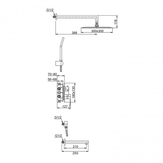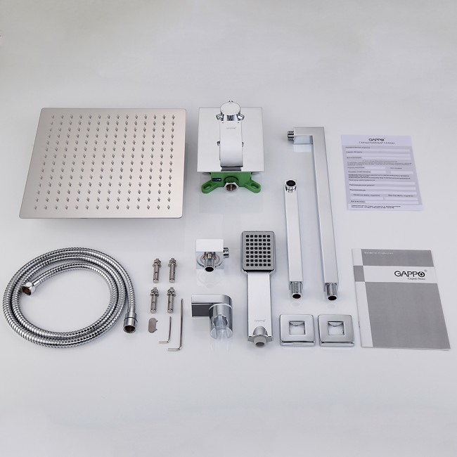 | Комплектация | Смеситель; Верхний душ; Держатель для душевой лейки; Душевая лейка; Душевой шланг; Кронштейн; Наружн |
