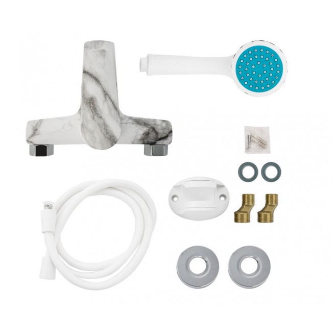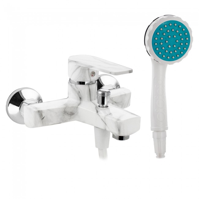 Смеситель из высокопрочного пластика АБС - БЕЛЫЙ Мрамор в ванную/душевую комнату с длинным, плоским изливом, литой корпус, шаровый с дивертором м/к на корпусе. Картридж d= 40мм, литая ручка,хромированный аэратор для экономии воды, хромированные чашки и эксцентрики. Габаритные размеры: ширина 150 мм, высота корпуса 170 мм, длина излива 300 мм, душевая лейка d=80 мм, шланг 150 см.