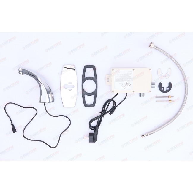 Количество в коробке: 10шт. Корпус смесителя в сборе с кабелем 65 см, декоративное основание, крепежная металлическая скоба и шпилька с гайкой, резиновые прокладки, 1 гибкая подводка 50 см (М10 - 1/2), блок управления с кабелем 80 см, комплект "Быстрый монтаж" (шурупы и дюбеля) для крепления блока управления.