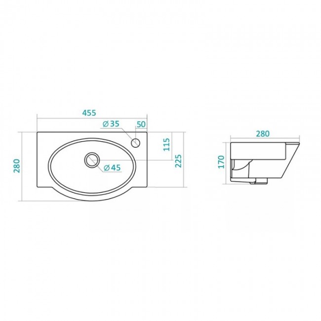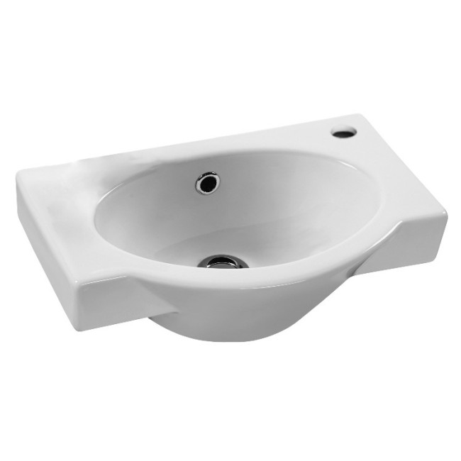 Благодаря прямоугольной форме и отверстию под смеситель с левой/правой стороны (на ваше усмотрение), модель может прекрасно разместиться как посередине стены, так и в углу комнаты. Кроме этого, умывальник имеет отверстия под слив и перелив.