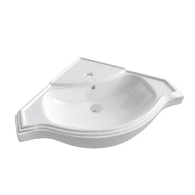 Продается только в комплекте с тумбой. Умывальник "Классик" угловой оснаще встроенным сливом-переливом.Хромированное кольцо перелива.Крышки перелива нет.