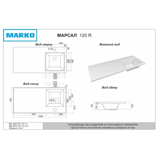 Умывальник Марсал 120 правая для установки над стиральной машиной 1200мм*482мм*145мм Marco