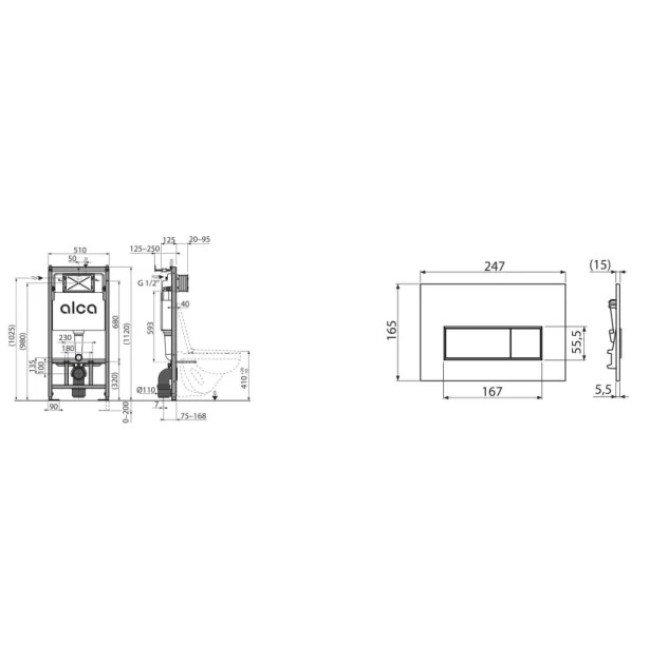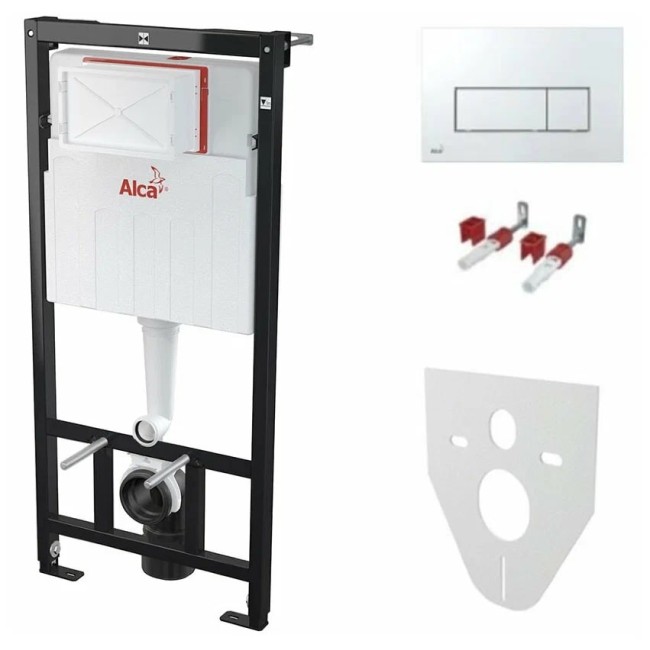 Кнопка хром глянец. Для установки подвесного унитаза с расстоянием между точками крепления 180 или 230 мм подойдет система инсталляции AlcaPlast Sadromodul AM101/1120-001. Изделие выполнено в виде рамного модуля для монтажа к гипсокартонной конструкции. Выполненная из металла несущая конструкция обработана порошковой краской, которая обеспечивает длительный срок службы. При помощи выдвижных ножек можно отрегулировать высоту унитаза в диапазоне 0–200 мм. Установленная система закрывается гипсокартонным листом и не нуждается в дополнительных крепежных элементах.