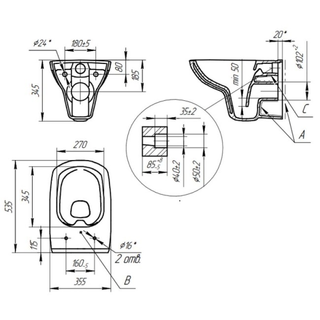 | Высота унитаза без упаковки, мм | 355 |