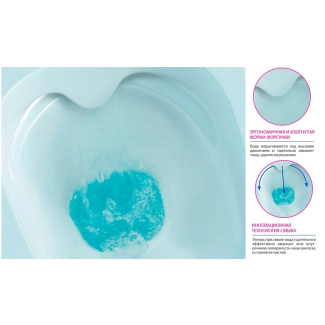 Унитаз настенный керамический безободковый; сиденье для унитаза из дюропласта ультратонкая легкосъемная с функцией плавного закрывания; инструкция/гарантийный талон.