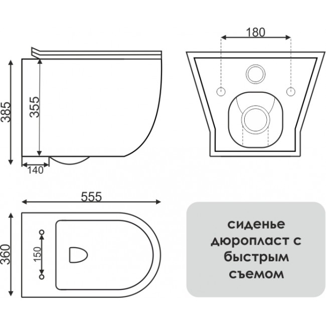 Унитаз подвесной К43 В комплект изделия входят: -крепления -сиденье из дюропласта Soft Close с антибактериальным покрытием и функцией быстрого съема -горизонтальный выпуск