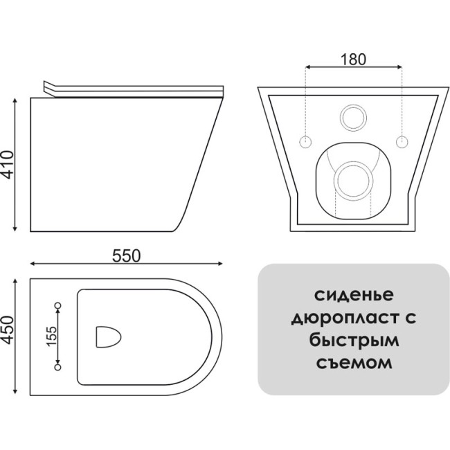 В комплект изделия входят: -крепления -сиденье из дюропласта Soft Close с антибактериальным покрытием и функцией быстрого съема -горизонтальный выпуск -полное прилегание к стене