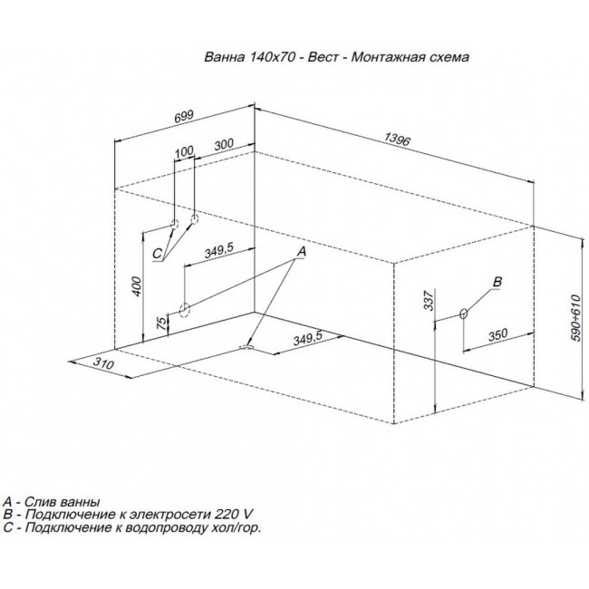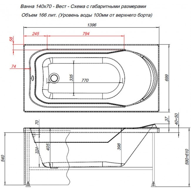 Ванна акриловая West 140*70 с каркасом и панелью 36-38 Aquanet