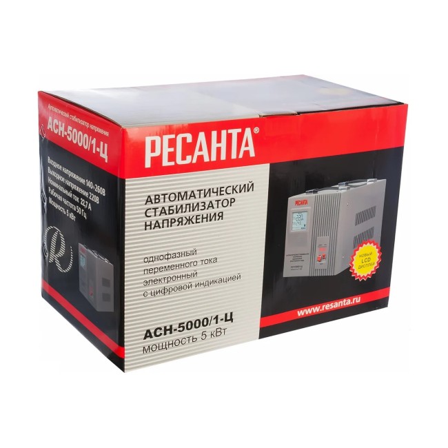Стабилизатор напряжения Ресанта АСН 5000/1-Ц релейного типа предназначен для выравнивания входного напряжения и защиты приборов от перепадов напряжения с суммарной мощностью до 5 кВт. Работает с напряжением 220В с точностью до +/-8%. Устройство оснащено фильтрами сетевых помех, предотвращающими искажение частотной синусоиды, микропроцессорным управлением и цифровым индикатором напряжения, на котором отображаются параметры напряжения. Превышение пределов поддерживаемого входного напряжения автоматически отключает подачу питания. Прочный корпус защищает внутренние узлы аппарата от повреждений. Данный стабилизатор может обеспечивать стабильным питанием - телевизор, ресивер, DVD проигрыватель, кассовый аппарат, газовый котел.