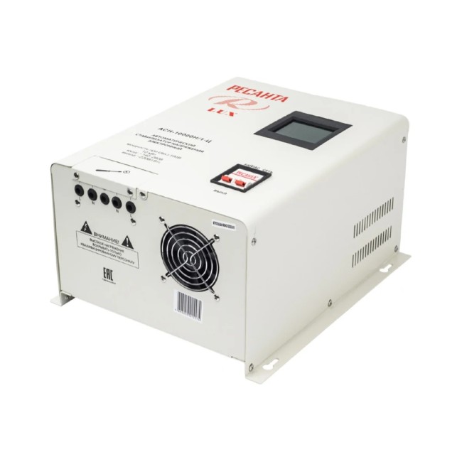 Стабилизатор напряжения серии LUX РЕСАНТА АСН-10000Н/1-Ц релейного типа предназначен для выравнивания входного напряжения и защиты приборов от перепадов напряжения с суммарной мощностью до 10 кВт. Работает с напряжением 220В с точностью до +/-8%. Устройство оснащено фильтрами сетевых помех, предотвращающими искажение частотной синусоиды, микропроцессорным управлением и цифровым индикатором напряжения, на котором отображаются параметры напряжения. Превышение пределов поддерживаемого входного напряжения автоматически отключает подачу питания. Прочный корпус защищает внутренние узлы аппарата от повреждений. Данный стабилизатор может обеспечивать стабильным питанием - телевизор, ресивер, DVD проигрыватель, кассовый аппарат, газовый котел.