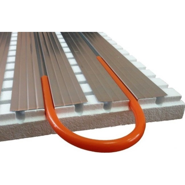 Теплораспределительная пластина для систем теплого пола без бетонной стяжки («сухой» способ монтажа). Материалом изделия служит оцинкованный стальной лист, в котором сформированы омегаобразный канал для нагревательной трубы диаметром 16 мм и четыре ребра жесткости, усиливающих конструкцию и компенсирующих тепловое расширение. От плотно охваченной трубы металл передает тепло расположенному сверху напольному покрытию, обеспечивая его равномерный прогрев. Длина пластины – 1000, ширина и, соответственно, минимальный шаг укладки трубы – 125 мм.