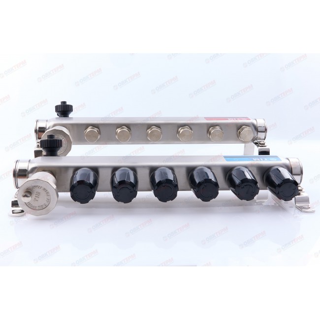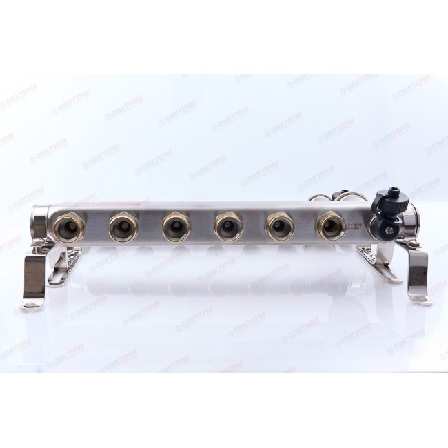 Коллекторная группа KBS5006 на 6 выхода 1" с автоматическими воздухоотводчиками, сливными кранами. Сделана из нержавеющей стали. Служит для распределения потоков по контурам теплого пола, радиаторного отопления, прочих климатических систем.