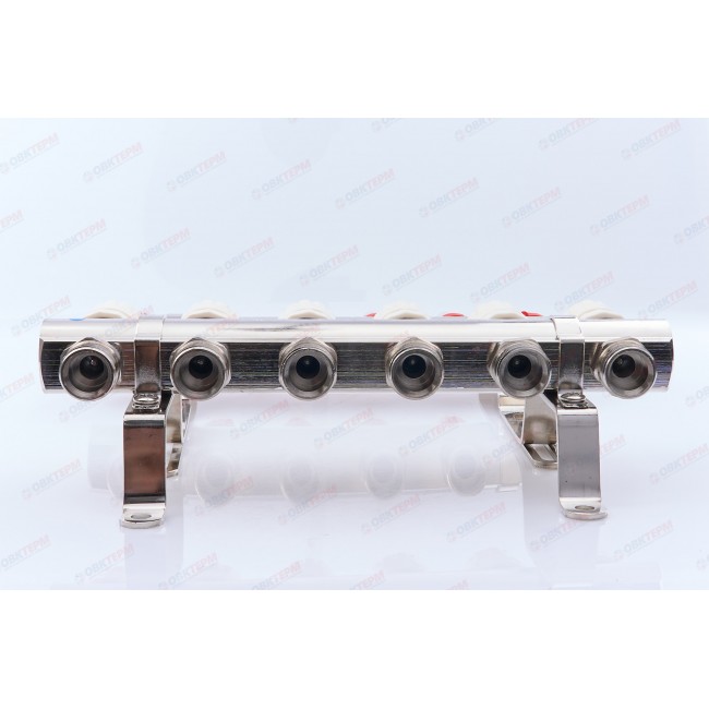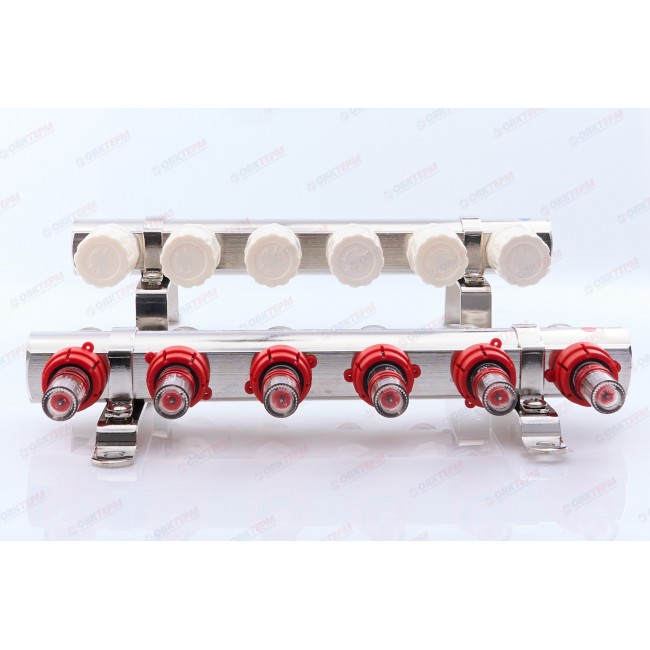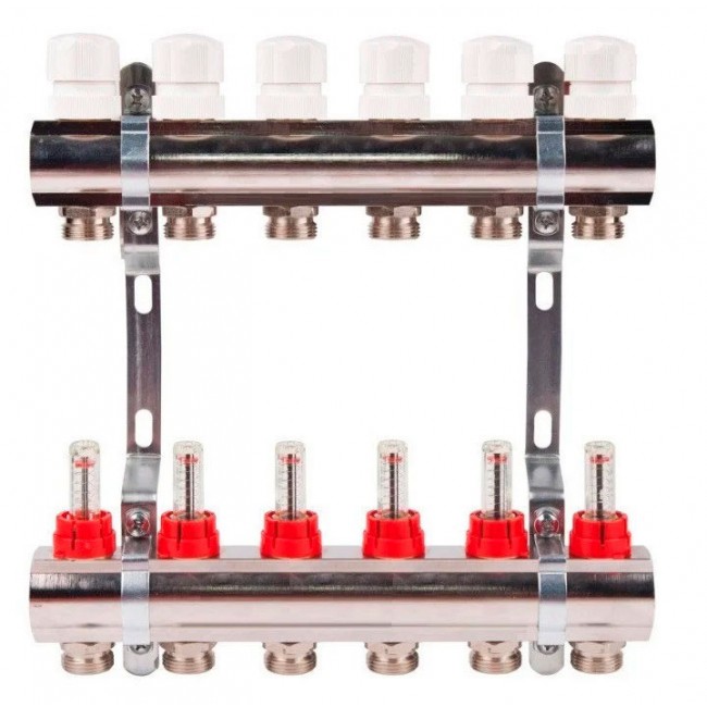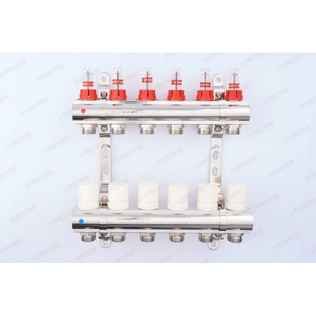 Коллектор с расходомерами латунный 1" на 6 выходов без сливных узлов KD006 TIM