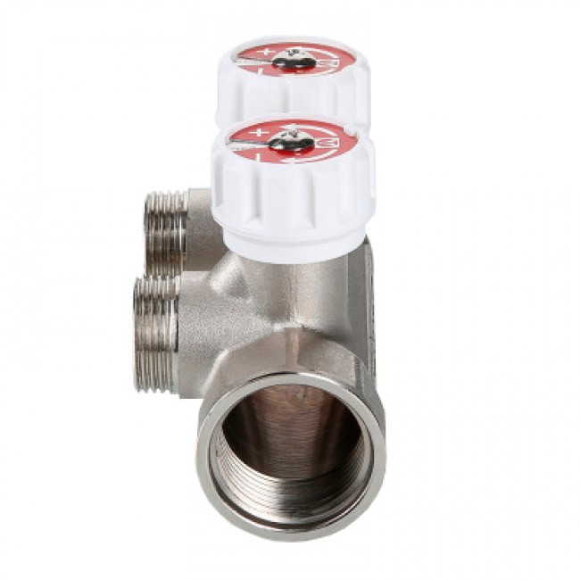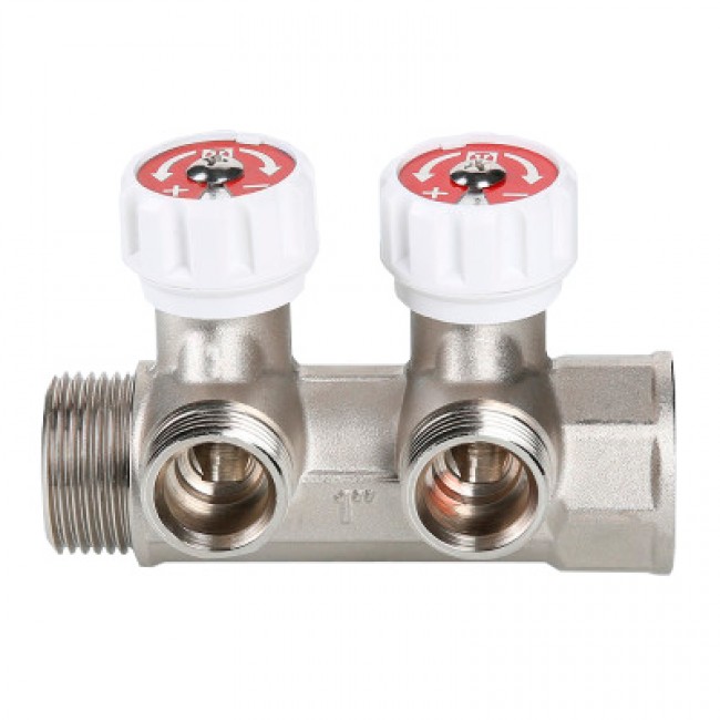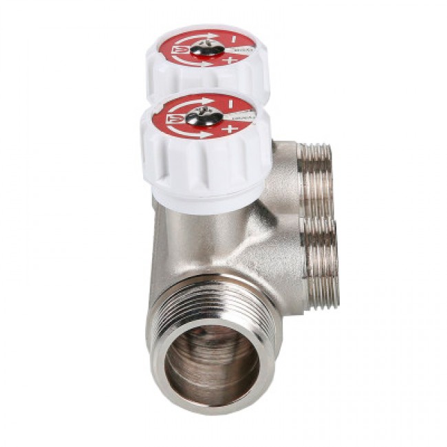 Латунный никелированный коллектор c выходами 3/4", «евроконус» (резьба – наружная). На каждом выходе предусмотрен вентиль для регулирования расхода рабочей среды. Диаметр коллектора – 1", резьба – внутренняя/наружная. Конструкция изделия обеспечивает подачу воды «под золотник» регулирующих вентилей при движении потока из коллектора к потребителю, что гарантирует качественное пропорциональное регулирование, не приводящее к появлению шумов в трубопроводной системе.