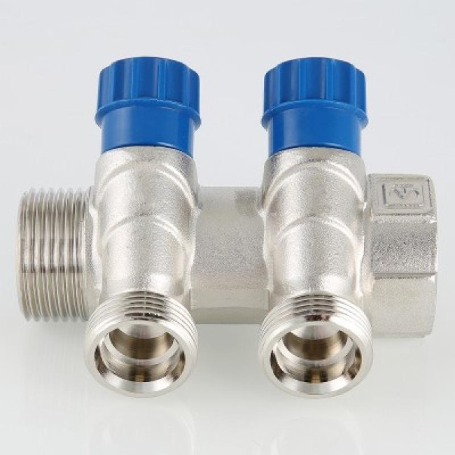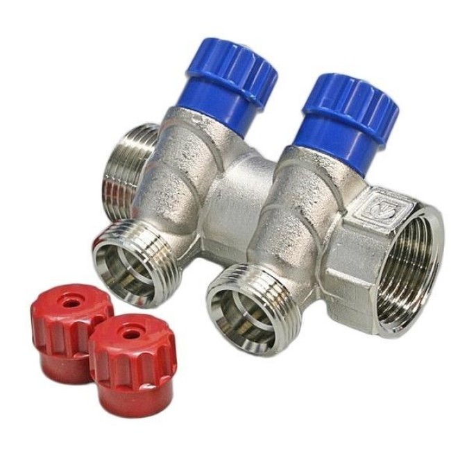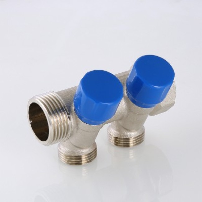 Латунный никелированный коллектор на 2, 3 и 4 выхода диаметром 1/2" с наружной резьбой. На каждом выходе предусмотрен вентиль для регулирования расхода рабочей среды со средним полным ресурсом 8 тыс. циклов. Диаметр коллектора – 3/4 или 1", резьба – внутренняя/наружная. Ремонтопригодный. Рабочая температура теплоносителя – до 110 °С, давление – до 10 бар. Применяется для распределения потоков жидкостей в контурах теплого пола, радиаторного отопления, холодного и горячего водоснабжения.