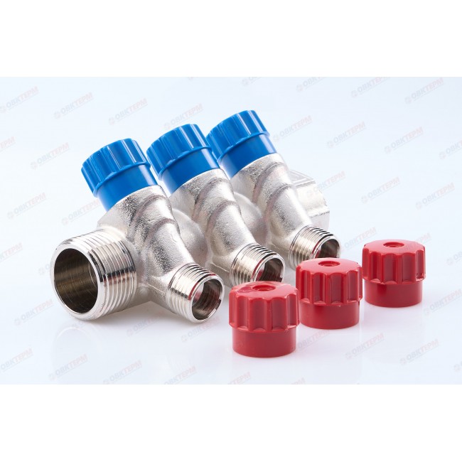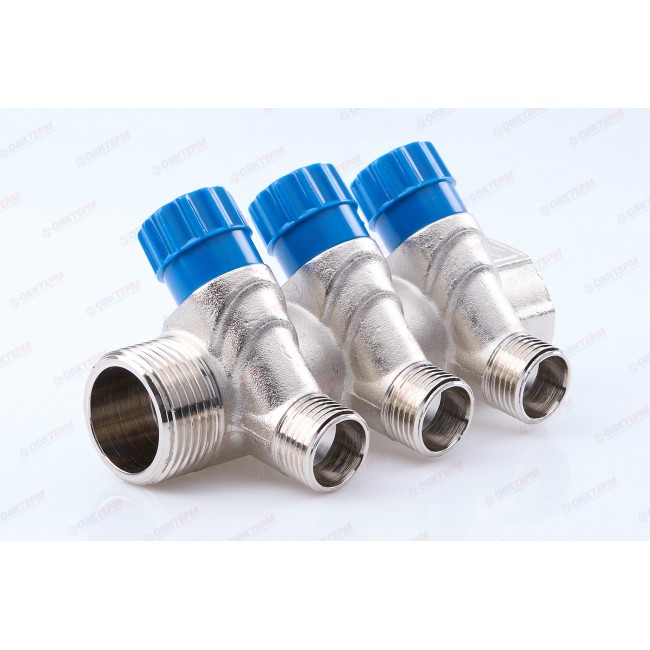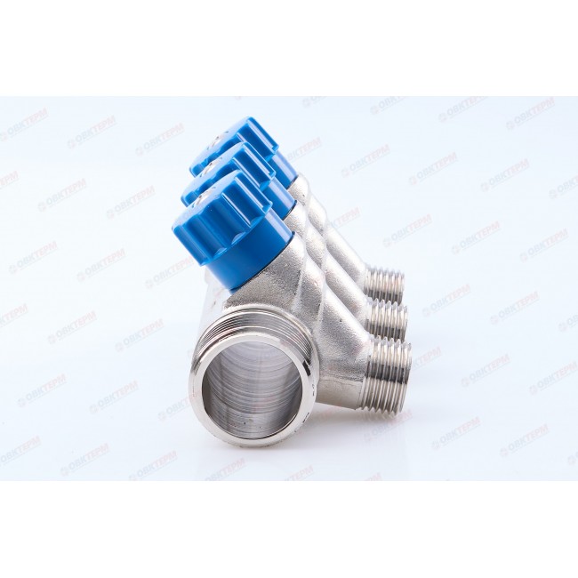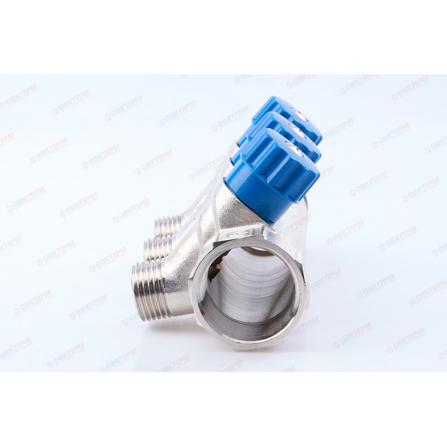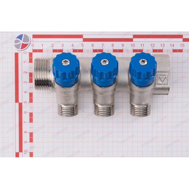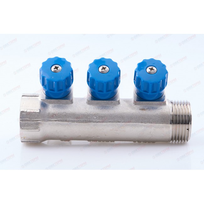 Латунный никелированный коллектор на 2, 3 и 4 выхода диаметром 1/2" с наружной резьбой. На каждом выходе предусмотрен вентиль для регулирования расхода рабочей среды со средним полным ресурсом 8 тыс. циклов. Диаметр коллектора – 3/4 или 1", резьба – внутренняя/наружная. Ремонтопригодный. Рабочая температура теплоносителя – до 110 °С, давление – до 10 бар. Применяется для распределения потоков жидкостей в контурах теплого пола, радиаторного отопления, холодного и горячего водоснабжения.