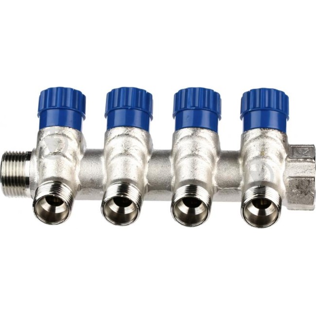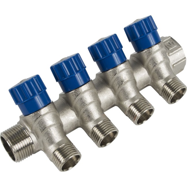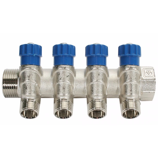 Латунный никелированный коллектор на 2, 3 и 4 выхода диаметром 1/2" с наружной резьбой. На каждом выходе предусмотрен вентиль для регулирования расхода рабочей среды со средним полным ресурсом 8 тыс. циклов. Диаметр коллектора – 3/4 или 1", резьба – внутренняя/наружная. Ремонтопригодный. Рабочая температура теплоносителя – до 110 °С, давление – до 10 бар. Применяется для распределения потоков жидкостей в контурах теплого пола, радиаторного отопления, холодного и горячего водоснабжения.