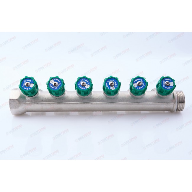Количество в упаковке: 3шт. Количество в коробке: 12шт. Коллектор для воды 1" х 3/4 на 6 выхода ТИМ под конус с регулировкой необходим для распределения подведенной от магистрали жидкости, от основного трубопровода к требуемым точкам водоразбора. Позволяет менять подачу воды. Температура перекачиваемой жидкости до 110С, давление - до 10 бар. Диаметр общего выхода - 1", с одной стороны внешняя резьба, с другой - внутренняя.