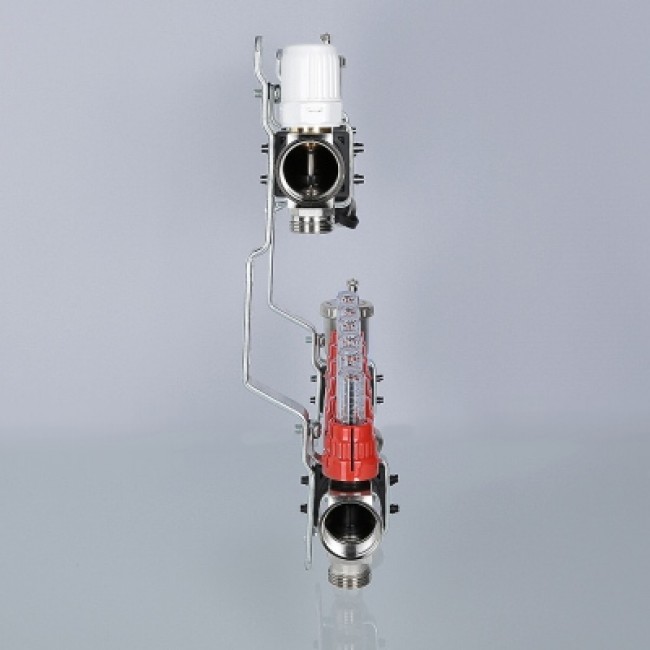 Коллекторный блок со встроенными расходомерами выпускается для распределения теплоносителя к потребителям в системах водяного отопления – радиаторам, конвекторам, петлям теплого пола, обогрева открытых площадок. Рабочая температура теплоносителя – до 90 °С, давление – до 10 бар. На выходах прямого коллектора установлены настроечные клапаны с расходомерами, обратный коллектор оснащен термостатическими клапанами (ручные, с возможностью оборудования сервоприводами). Присоединение трубопроводов к выходам – по стандарту «евроконус». Блок укомплектован также автоматическими воздухоотводчиками с отсекающими клапанами, дренажными кранами, сдвоенными крепежными кронштейнами. Материал коллекторов, корпусов арматуры – латунь CW617N (гальванопокрытие – никелирование), уплотнительных колец соединителей и золотников клапанов – EPDM.