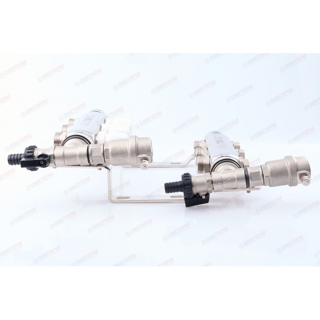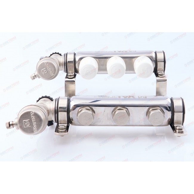 Коллекторные блоки для распределения теплоносителя по петлям теплого пола или по приборам отопления. Выходы подающего коллектора укомплектованы ручными регулировочными клапанами с расходомерами, обратного – ручными запорными клапанами, на которые можно установить электротермические сервоприводы. Каждый коллектор имеет автоматический воздухоотводчик и дренажный клапан. Материал корпуса – нержавеющая сталь AISI 304, фитинги, детали термоклапана, корпус воздухоотводчика выполнены горячим штампованием из латуни CW617N, уплотнительные кольца, золотниковые прокладки клапанов – из EPDM 70Sh. Количество выходов – от 2 до 12, рабочее давление – 8 бар, рабочая температура – 90 °С. Условный диаметр коллекторов – 1". Резьба выходов – наружная, 3/4". Присоединение циркуляционных петель осуществляется с помощью фитингов стандарта «евроконус».