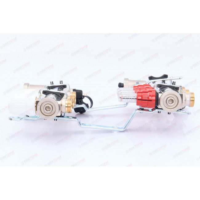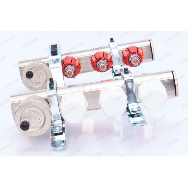 Коллекторный блок со встроенными расходомерами выпускается для распределения теплоносителя к потребителям в системах водяного отопления – радиаторам, конвекторам, петлям теплого пола, обогрева открытых площадок. Рабочая температура теплоносителя – до 90 °С, давление – до 10 бар. На выходах прямого коллектора установлены настроечные клапаны с расходомерами, обратный коллектор оснащен термостатическими клапанами (ручные, с возможностью оборудования сервоприводами). Присоединение трубопроводов к выходам – по стандарту «евроконус». Блок укомплектован также автоматическими воздухоотводчиками с отсекающими клапанами, дренажными кранами, сдвоенными крепежными кронштейнами. Материал коллекторов, корпусов арматуры – латунь CW617N (гальванопокрытие – никелирование), уплотнительных колец соединителей и золотников клапанов – EPDM.