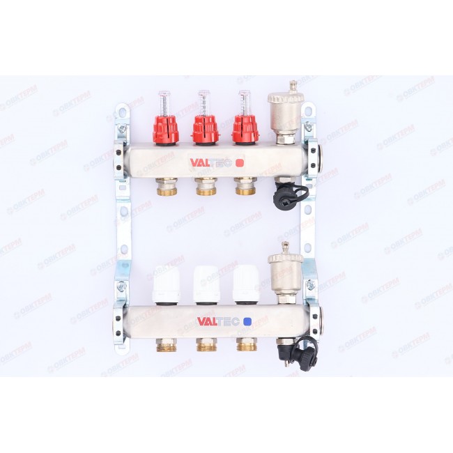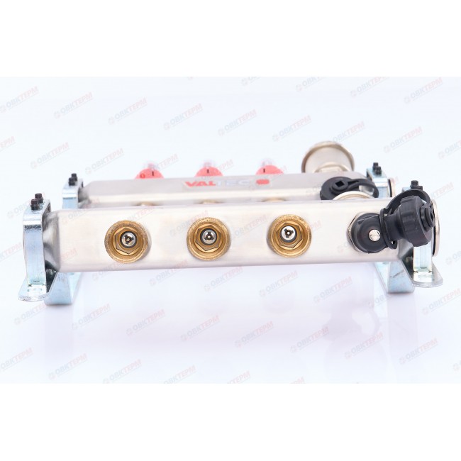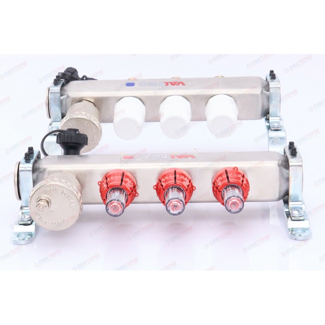 Коллекторные блоки для распределения теплоносителя по петлям теплого пола или по приборам отопления. Выходы подающего коллектора укомплектованы ручными регулировочными клапанами с расходомерами, обратного – ручными запорными клапанами, на которые можно установить электротермические сервоприводы. Каждый коллектор имеет автоматический воздухоотводчик и дренажный клапан. Материал корпуса – нержавеющая сталь AISI 304, фитинги, детали термоклапана, корпус воздухоотводчика выполнены горячим штампованием из латуни CW617N, уплотнительные кольца, золотниковые прокладки клапанов – из EPDM 70Sh. Количество выходов – от 2 до 12, рабочее давление – 8 бар, рабочая температура – 90 °С. Условный диаметр коллекторов – 1". Резьба выходов – наружная, 3/4". Присоединение циркуляционных петель осуществляется с помощью фитингов стандарта «евроконус».