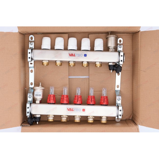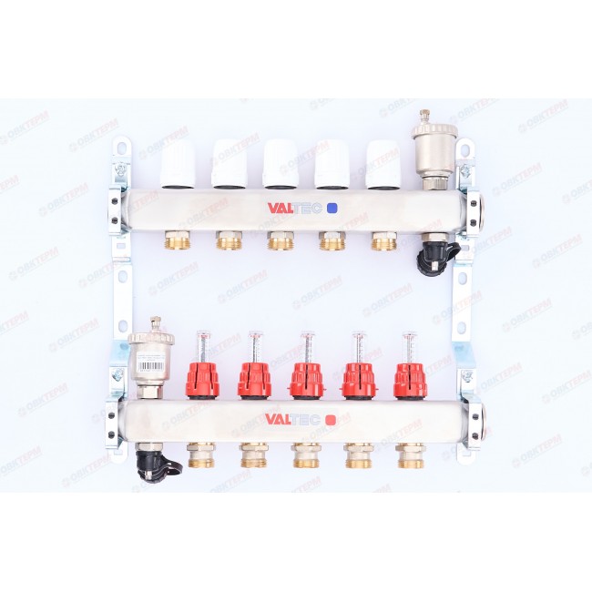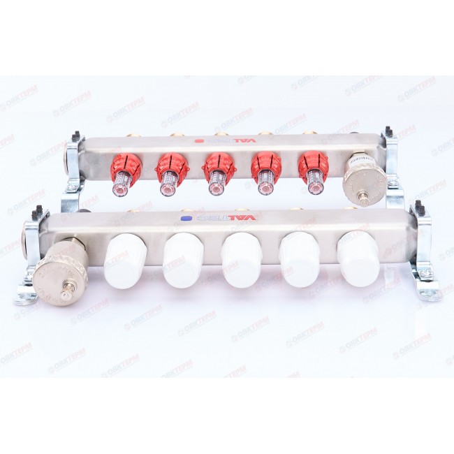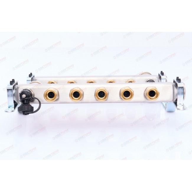 Коллекторные блоки для распределения теплоносителя по петлям теплого пола или по приборам отопления. Выходы подающего коллектора укомплектованы ручными регулировочными клапанами с расходомерами, обратного – ручными запорными клапанами, на которые можно установить электротермические сервоприводы. Каждый коллектор имеет автоматический воздухоотводчик и дренажный клапан. Материал корпуса – нержавеющая сталь AISI 304, фитинги, детали термоклапана, корпус воздухоотводчика выполнены горячим штампованием из латуни CW617N, уплотнительные кольца, золотниковые прокладки клапанов – из EPDM 70Sh. Количество выходов – от 2 до 12, рабочее давление – 8 бар, рабочая температура – 90 °С. Условный диаметр коллекторов – 1". Резьба выходов – наружная, 3/4". Присоединение циркуляционных петель осуществляется с помощью фитингов стандарта «евроконус».
