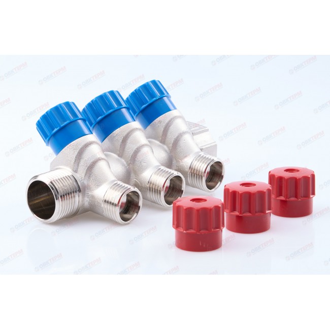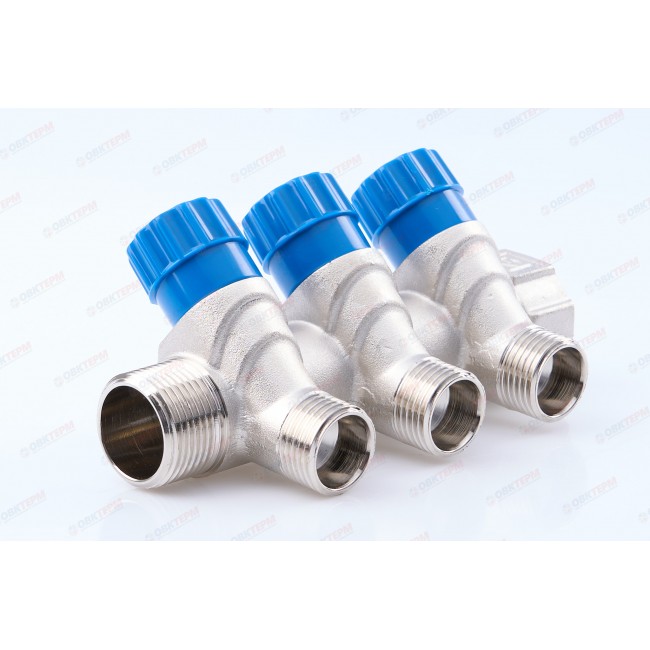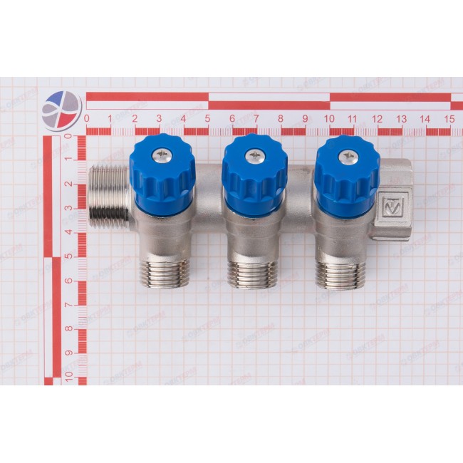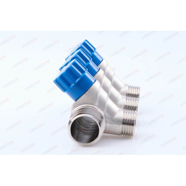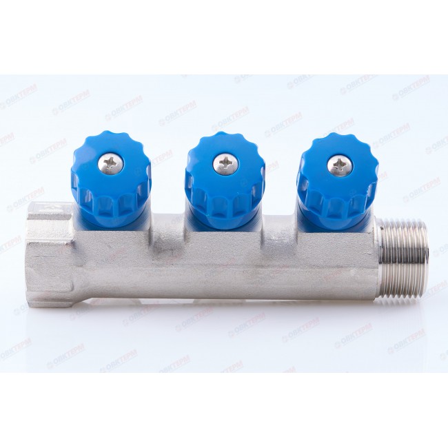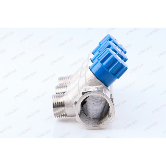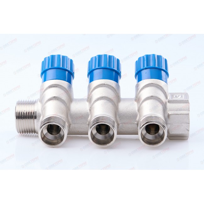 Латунный никелированный коллектор на 2, 3 и 4 выхода диаметром 1/2" с наружной резьбой. На каждом выходе предусмотрен вентиль для регулирования расхода рабочей среды со средним полным ресурсом 8 тыс. циклов. Диаметр коллектора – 3/4 или 1", резьба – внутренняя/наружная. Ремонтопригодный. Рабочая температура теплоносителя – до 110 °С, давление – до 10 бар. Применяется для распределения потоков жидкостей в контурах теплого пола, радиаторного отопления, холодного и горячего водоснабжения.