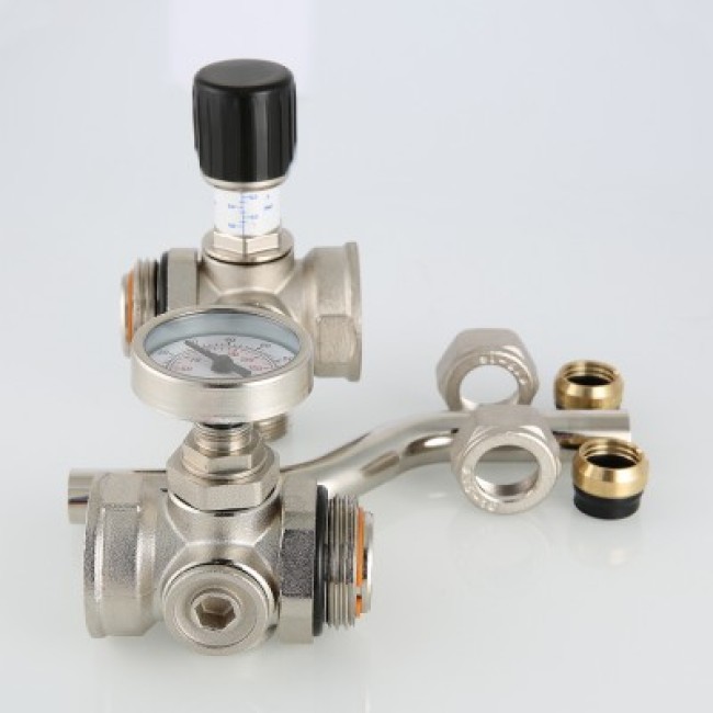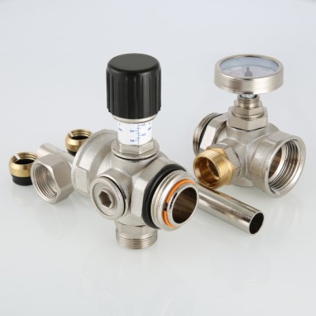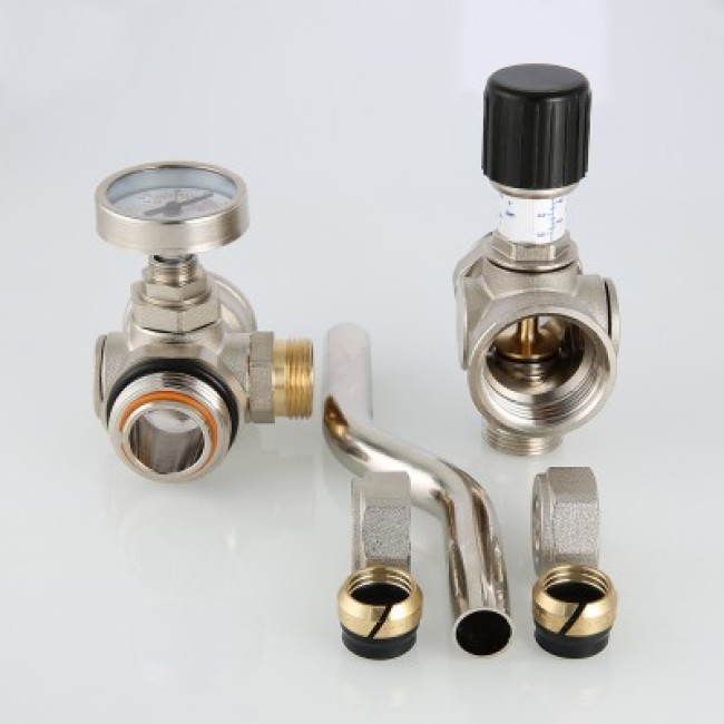 Байпасы VALTEC с перепускным клапаном применяются совместно с коллекторными блоками VTc 594 EMNX и 596 EMNX для перенаправления потока теплоносителя к обратному коллектору в случае, когда расход через коллекторные петли уменьшается ниже заданного значения. Это позволяет сохранять гидравлические характеристики системы независимо от положения органов управления коллекторных петель (ручные, термостатические клапаны и др.), защитить насос от работы «на закрытую задвижку».Байпас VT.0667T – проходной (монтируется перед коллекторным узлом), комбинируется с погружным термометром VT 0617. Детали его корпуса выполнены горячим прессованием из латуни марки CW617N, никелированы, перепускная трубка – медная, никелированная. Материал уплотнений – эластомер EPDM. Максимальная рабочая температура теплоносителя – 120 °C, номинальное рабочее давление – 10 бар. Диапазон настройки перепада давлений – 20–60 кПа, пропускная способность Kvs – 4,33 м3/ч.