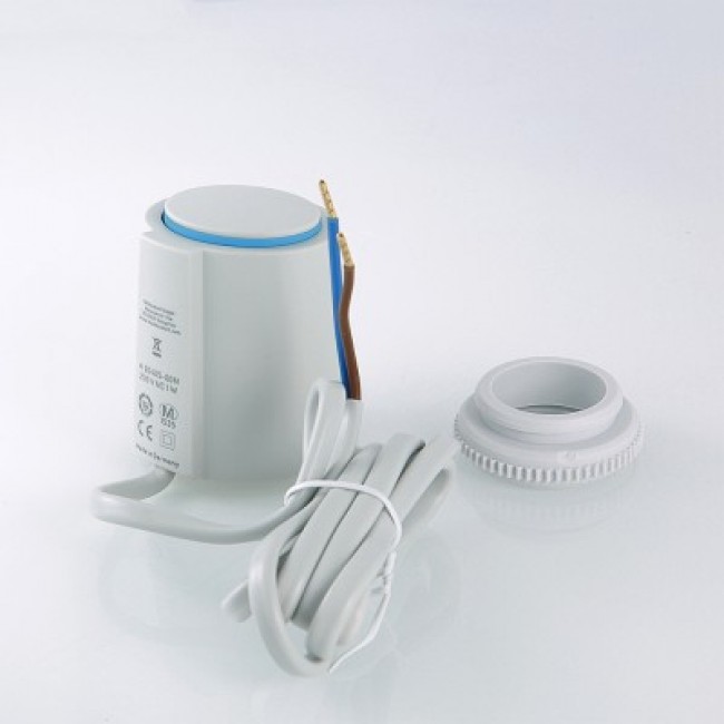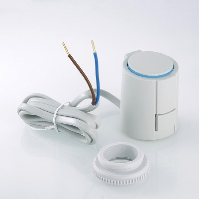 Привод для автоматического управления радиаторным или коллекторным термостатическим клапаном систем водяного теплого пола и охлаждения зданий по сигналу от термостата, датчика или контроллера. Действие основано на расширении заполняющего сильфон армированного парафина при протекании электрического тока через встроенный нагревательный элемент. Нормально открытый. Присоединение сервопривода к клапану – через переходник (в комплекте).