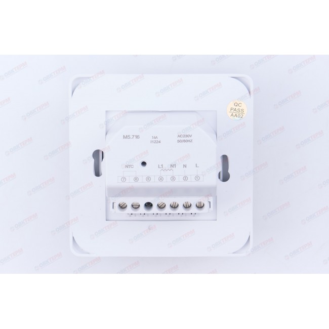 Программируемый терморегулятор TIM M5.716 с возможностью понедельного программирования. Позволяет настроить температурные режимы для 6 периодов, в течение всего дня для более комфортного и экономичного распределения ресурсов. Обладает встроенным датчиком температуры воздуха и температуры пола. Электронный термостат (панель управления комнатный),
