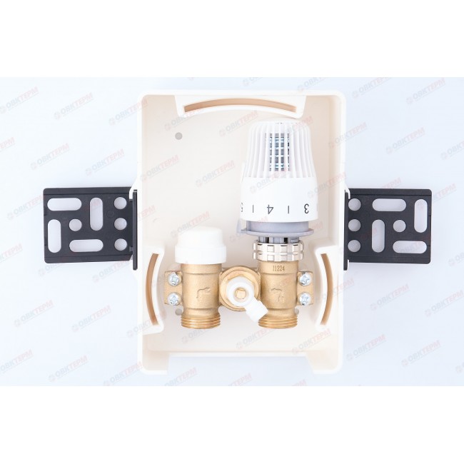 Данное устройство позволяет регулировать контур напольного отопления по температуре воздуха, и идеально подходит для «теплого пола» небольшой площади, например, в ванной комнате, или отдельных помещениях. В комплект входят комбинированный термостатический клапан , термостатическая головка, воздухоотводный клапан и короб с крышкой для установки узла в стену.