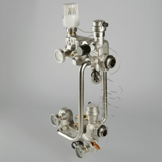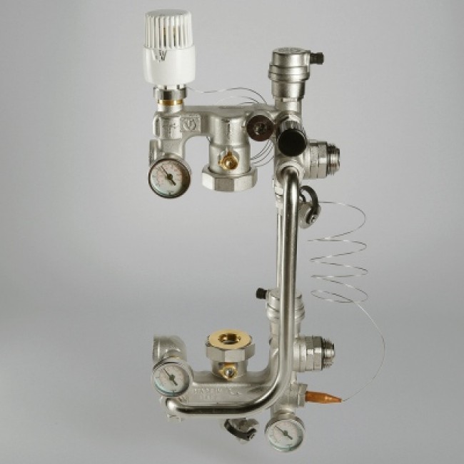 В насосно-смесительном узле VALTEC COMBI для водяных теплых полов приготовление теплоносителя с температурой от 20 до 60 °С происходит за счет подмеса жидкости из обратной линии. Регулирование осуществляется двухходовым клапаном, установленным в подающем коллекторе и управляемым термостатической головкой с выносным погружным датчиком, который размещен на выходе смесительного узла.(При использовании контроллера отопления функция управления клапаном передается ему.) Балансировочный клапан в линии подмеса задает соотношение теплоносителя, поступающего из обратной линии вторичного контура и прямой линии первичного. Другие основные элементы узла: байпас с перепускным клапаном; встроенные шаровые краны для отключения циркуляционного насоса; автоматический воздухоотводчик; погружные термометры.