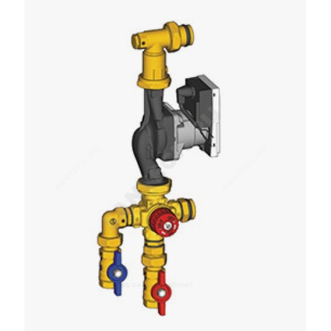 Насосно-смесительный узел для систем напольного отопления, компактного исполнения, со смесительным трехходовым термостатическим клапаном Содержит циркуляционный насос с частотным электронным регулированием