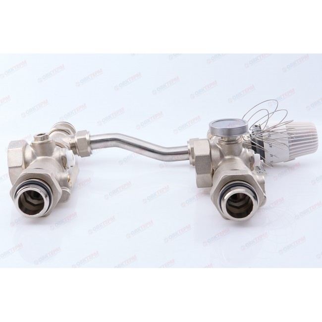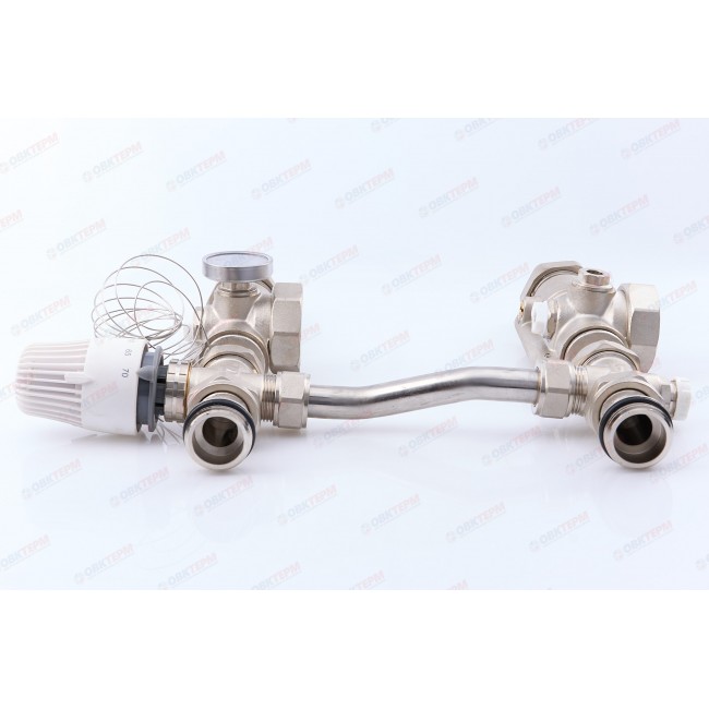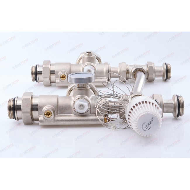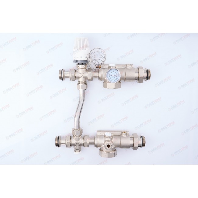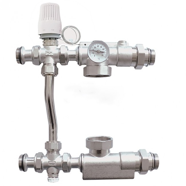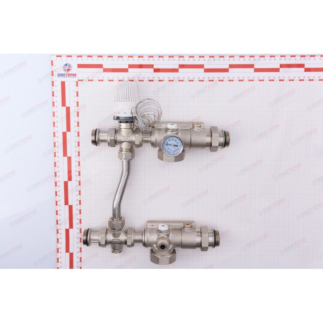 Насосно-смесительный узел для систем отопления с байпасом (без насоса), 130мм Из нержавейки. В комплекте: термоголовка, байпас, термометр, датчик температуры, сторож температуры. Устанавливается насос с установочным расстоянием 130мм