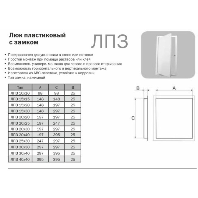 Люк-дверца обеспечивает быстрый доступ к оборудованию, коммуникациям и другим скрытым узлам, инженерным коммуникациям и имеет отличные эксплуатационные характеристики: надежность, прочность, удобство использования и установки. Есть возможность универсального монтажа для левого и правого открывания. Устанавливается в стене или потолке. Монтаж осуществляется при помощи клея или раствора. Изготовлен из ABS-пластика. Имеет нажимной тип замка.