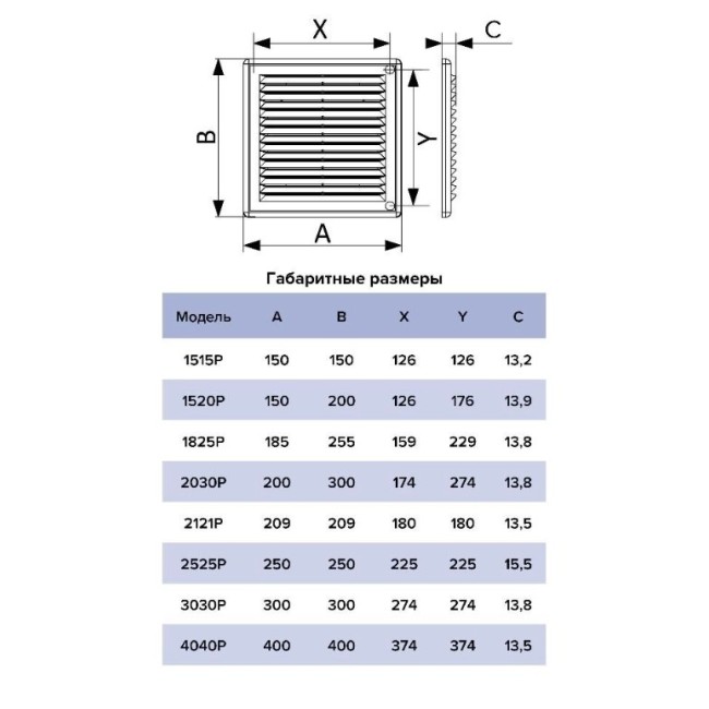 Предназначена для декоративного оформления выходов приточных или вытяжных вентиляционных систем. Вентиляционная решетка состоит из двух частей: рамки и решетки с жалюзи. Рамка монтируется непосредственно на поверхность с помощью саморезов или клея. Решетка вставляется в рамку. Это позволяет легко снимать изделие для обслуживания. Решетка оснащена наклонными жалюзи, которые помогают скрыть вентиляционный выход, а также антимоскитной сеткой для защиты от насекомых. Решетки Р представлены также в коричневом, бежевом и черных цветах.